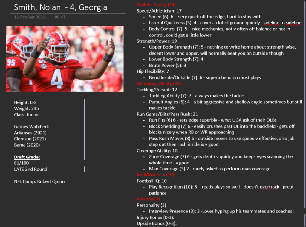 Nolan Smith has flown under the radar of many during his time at UGA simply due to the sheer number of star-studded quality players they have had on the defensive side of the ball in recent years. However in 2019 as a freshman, he co-won Defensive Newcomer of the Year for UGA, then in 2020 played a major role in all 10 games. 2021 has been Smith’s breakout season, starting at OLB for all 8 games to this point and winning SEC Co-Defensive Player of the Week twice for great performances against South Carolina and Florida. In the latter game, he had his first forced fumble, fumble recovery, and interception for the Bulldogs in a 39 second span during the 2nd quarter.