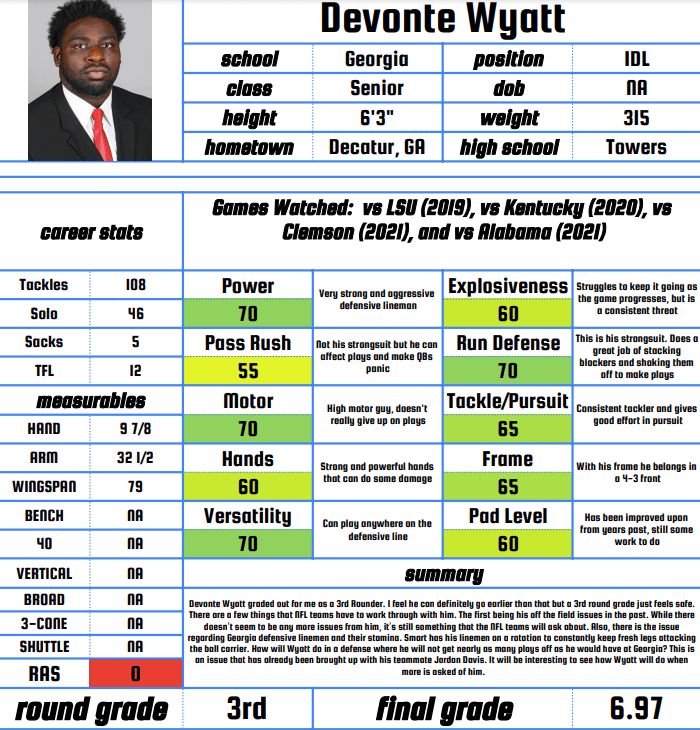 Summary: Although a 3rd round grade feels safe, I feel Wyatt can definitely go earlier than that. There are a few things that NFL teams have to work through with him. The first is his off-the-field issues in the past. While there doesn’t seem to be any more issues from him, it’s still something that the NFL teams will ask about. Also, there is the issue regarding Georgia defensive linemen and their stamina. Smart has his linemen on a rotation to constantly keep fresh legs attacking the ball carrier. How will Wyatt do in a defense where he will not get nearly as many plays off as he would have at Georgia? This is an issue that has already been brought up with his teammate Jordan Davis. It will be interesting to see how Wyatt will do when more is asked of him.