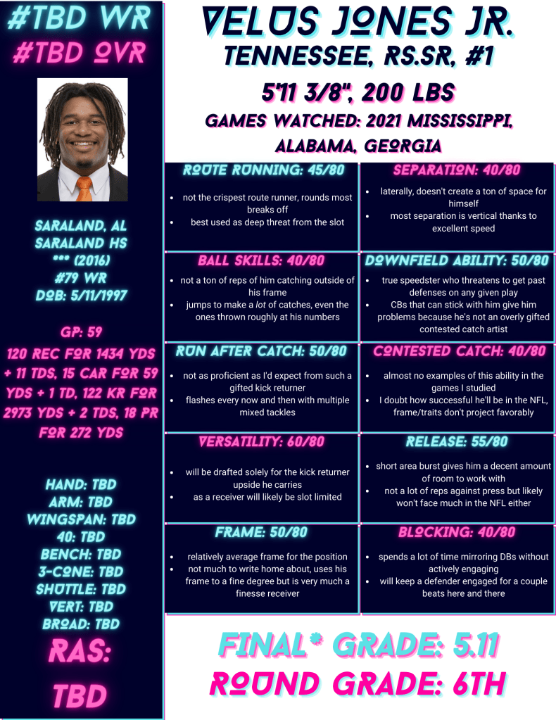 Separation – 40 (Below Average): Laterally, Jones really doesn’t create a ton of separation. I noticed on out-breaking routes and slants that corners typically don’t have much trouble hanging with him, which also limited his targets due to Hendon Hooker’s hesitancy to throw into tighter windows. Vertically, however, Jones has speed that I’d quantify as a tier or two below game-breaking, which usually gives him a fair bit of leeway downfield.
