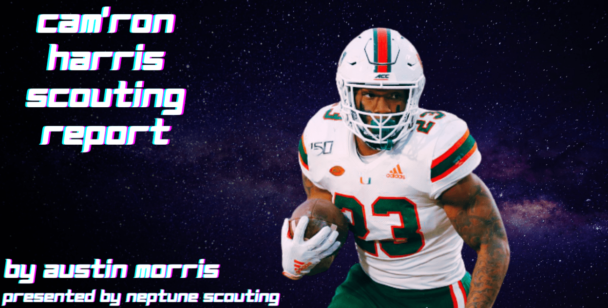 Cam’Ron Harris, formerly known as Cam’Ron Davis, was a four star recruit out of Miami Carol City High School. He was at one time rated the 7th best running back in the nation and the 29th best overall prospect in the state of Florida. At the time of his recruitment, he had received offers from the likes of Georgia, Oregon, Tennessee, and Wisconsin before ultimately choosing to play for the Miami Hurricanes. He didn’t get a lot of starts until his sophomore season and then he was in the regular rotation for his team. Miami uses a split backfield most of the time, so for most of his career he has shared carries with Jaylan Knighton. 2021 was a disappointing season as a whole for the Hurricanes but it was especially frustrating for Harris. Halfway through the season, he injured his knee and missed the remainder of the season.